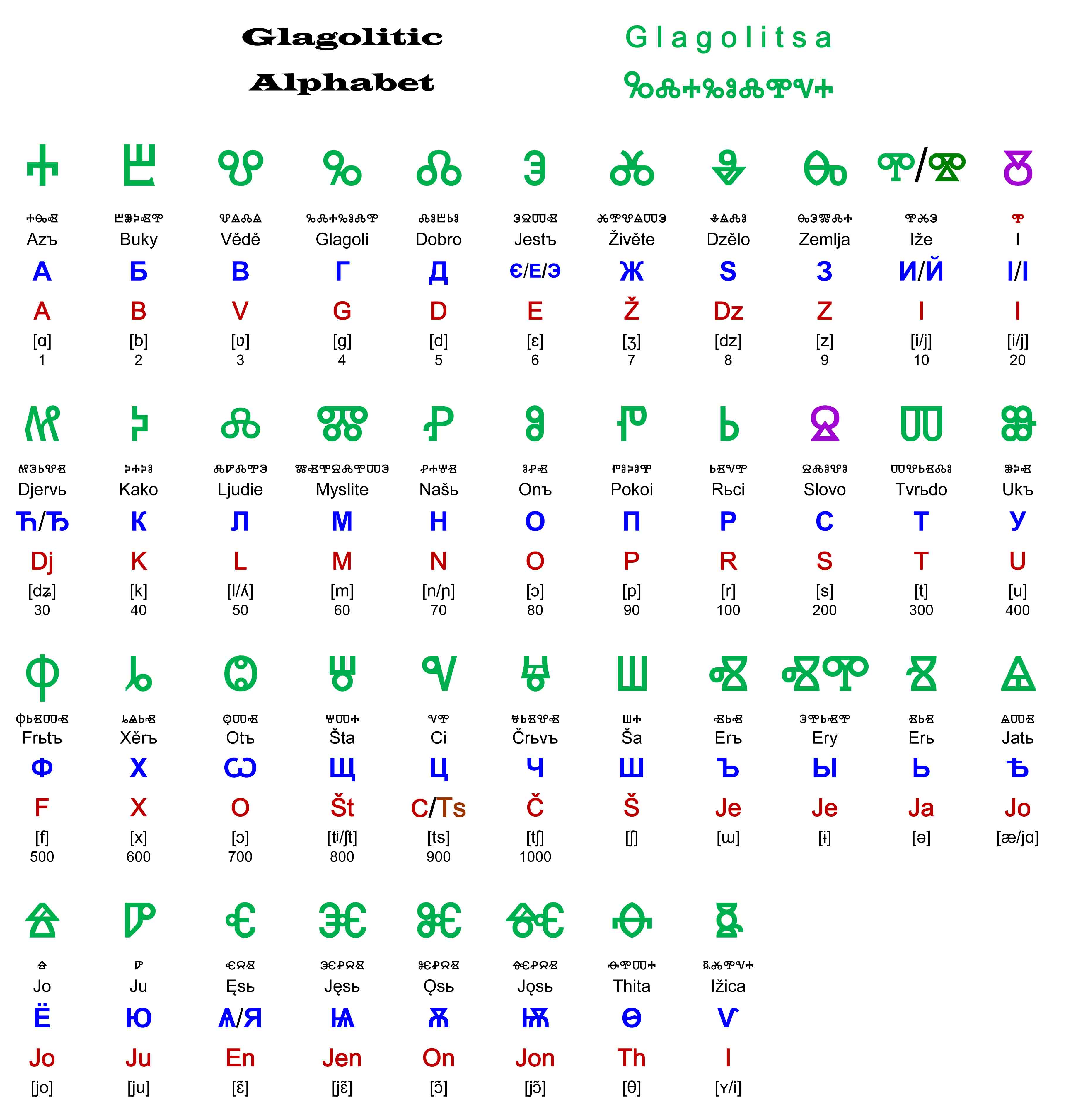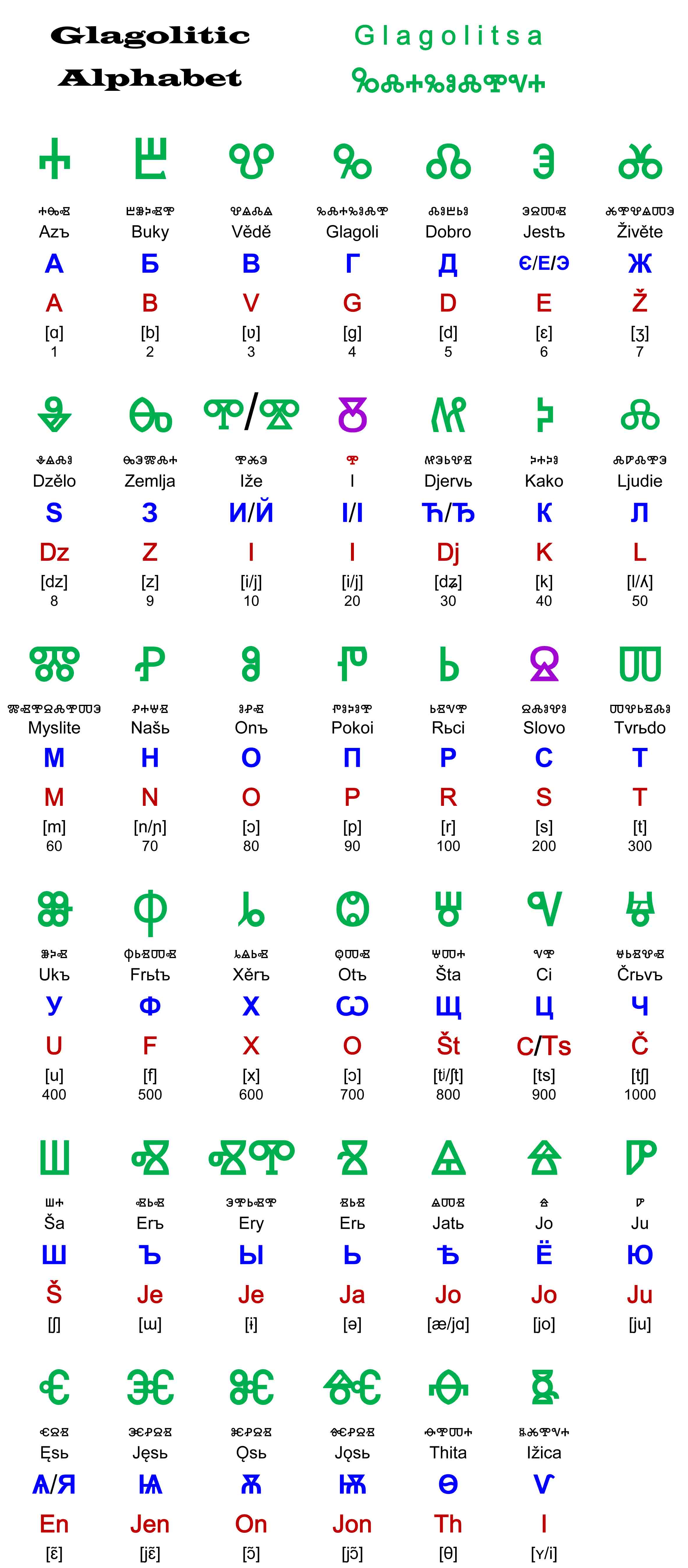 The Glagolitic letters are Green, (Two of those
